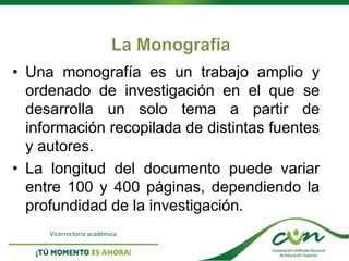 Este documento define una monografía como un trabajo de investigación amplio y ordenado sobre un solo tema, el cual puede variar entre 100 y 400 páginas dependiendo de la profundidad de la investigación. Explica que las monografías se pueden clasificar como de compilación, investigación o análisis de experiencias, y enumera las características que debe cumplir un trabajo para ser considerado científico, como presentar información nueva de forma clara y concisa, y proporcionar una utilidad y sustento para una hipótesis.