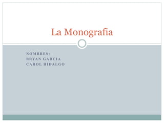 Este documento proporciona información sobre lo que es una monografía de grado y sus requisitos. Explica que una monografía es un trabajo de investigación escrito por estudiantes que sigue un proceso que incluye seleccionar un tema, formular objetivos e hipótesis, recopilar información, y redactar un informe. También describe la estructura requerida de una monografía que incluye una portada, resumen, introducción, cuerpo con capítulos, conclusiones y bibliografía.