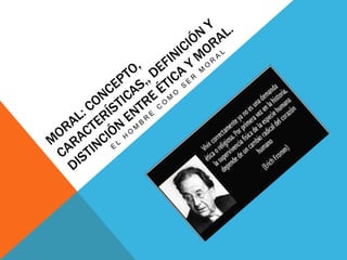 Este documento introduce los conceptos de ética y moral. Explica que la moral se refiere a las normas y reglas que regulan el comportamiento en una sociedad en particular, mientras que la ética busca fundamentar cómo debe comportarse cualquier ser humano de manera universal. También destaca que los seres humanos son los únicos capaces de realizar acciones morales porque poseemos conciencia, libertad y voluntad.