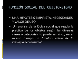 Este documento analiza la función social de los objetos como signos de clase y estatus. Discute cómo los objetos adquieren significados más allá de su uso funcional, funcionando como marcadores culturales que comunican la posición social de una persona. También contrasta las prácticas de consumo de objetos entre las clases altas e instruidas versus las clases medias e inferiores.