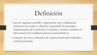 La música se compone de melodía, armonía y ritmo. La melodía es una sucesión de sonidos percibidos como una sola entidad que se desarrolla a lo largo del tiempo. La armonía es el estudio de la combinación de acordes y la proporción entre las partes de una composición musical. El ritmo es una secuencia repetida en el tiempo definida por la sucesión de elementos fuertes y débiles. La práctica musical mejora el rendimiento cerebral al activar ambos hemisferios y ejercitar funciones como la concentración