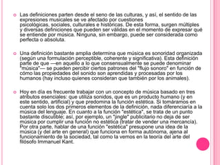 Las definiciones de música varían según factores culturales e históricos, por lo que no existe una definición perfecta. Una definición amplia considera música a cualquier sonido organizado de forma coherente y significativa. Hoy en día, se define la música como el uso de sonidos producidos por humanos con una función estética, aunque esta función es discutible y la música también cumple otras funciones como la publicidad.