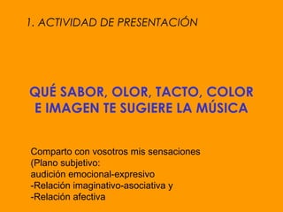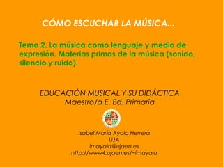 Este documento presenta información sobre la música como lenguaje y medio de expresión, incluyendo las materias primas de la música como el sonido, silencio y ruido. Explica conceptos como los diferentes planos de escucha musical (sensual, expresivo y musical), y características del sonido como altura, intensidad, duración y timbre. También discute el ruido y su relación con la música.