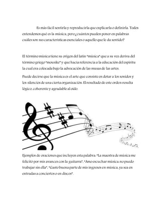 El documento define la música como el arte de organizar sonidos y silencios de manera lógica y agradable al oído. Explica que la música se origina de la combinación de elementos como la armonía, melodía y ritmo. Además, señala que la música estimula la percepción humana y puede transmitir información o emociones, acompañando la vida humana desde sus orígenes. Finalmente, menciona que la música se usa en terapias para mejorar la comunicación y expresión individual.
