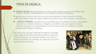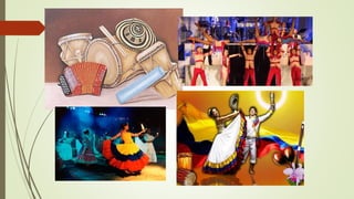 Este documento describe los diferentes tipos y géneros de música en Colombia. Explica que existen varios tipos de música como sacra, profana, dramática, de danza e incidental. Luego detalla los diversos géneros musicales asociados con cada región de Colombia, incluyendo la música del Caribe, Pacífico, los Andes, los Llanos, la Amazonía e islas. La música colombiana contiene una rica diversidad de estilos que reflejan las fusiones culturales a lo largo de la historia del país.
