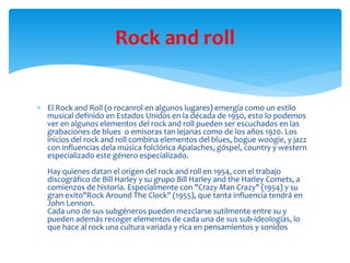 El documento explora la evolución y características de varios géneros musicales como rock and roll, pop, rap, ska, reggae, blues, jazz, música clásica, reggaetón, salsa y cumbia, destacando sus raíces históricas y culturales. También menciona cómo la música influye en la vida de los jóvenes, siendo fuente de entretenimiento y conocimiento, y plantea la dualidad de sus mensajes en relación con el comportamiento social. Finalmente, enfatiza la diversidad de ritmos y estilos que enriquecen la cultura musical global.
