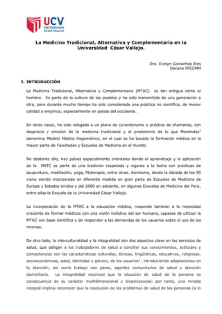 La medicina tradicional, alternativa y complementaria (MTAC) se integra en la formación médica de la Universidad César Vallejo, respondiendo a la creciente demanda de enfoques holísticos en salud y la necesidad de formar profesionales con competencias en esta área. A pesar de su estigmatización en el ámbito occidental, la MTAC ha mostrado eficacia y aceptación, y se ha incorporado en los currículos de diversas facultades de la universidad. Se enfatiza la necesidad de acreditar a los profesionales en MTAC y de reconocer su valor cultural y práctico en la atención médica integral.