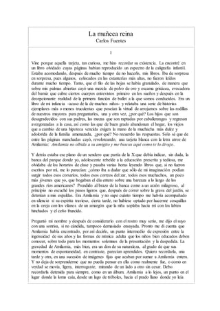Este documento narra la historia de un hombre que encuentra una vieja tarjeta de una niña llamada Amilamia con la que solía jugar en el parque cuando era adolescente. Esto lo lleva a recordar sus tardes en el parque leyendo junto a Amilamia y la transición en su relación de indiferencia a aceptación y luego rechazo de su compañía. Años después, el hombre busca a Amilamia siguiendo la dirección en la tarjeta para satisfacer su curiosidad sobre qué fue de ella, aunque duda que todav