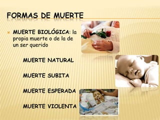 Este documento trata sobre la muerte y las formas de afrontarla. Discute diferentes tipos de muerte como la biológica, natural, violenta, y psicológica. También cubre temas como las decisiones de final de vida como testamentos vitales y donación de órganos. Explora conceptos como calidad de vida y muerte, y actitudes contemporáneas hacia la muerte como el miedo a lo desconocido.