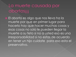 El documento discute varios temas relacionados con el aborto, incluyendo los riesgos para la salud de las mujeres que buscan abortos ilegales, el estado legal del aborto en Colombia y otros países, y los debates éticos en torno a si el aborto debería ser legal o no. Se mencionan las tres causales legales para el aborto en Colombia y se reconoce que la mayoría de los países del mundo ahora permiten el aborto a pesar de la oposición de la Iglesia Católica.