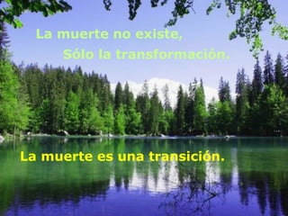 Este documento trata sobre la muerte y cómo no es más que una transformación. Aunque la muerte asusta, nada es permanente y todo está en constante cambio. Debemos apreciar nuestro tiempo en la tierra y vivir intensamente, celebrando la vida. La muerte es parte natural de la vida y no debemos temerla ni lamentarla, sino verla como una evolución hacia nuevas formas.
