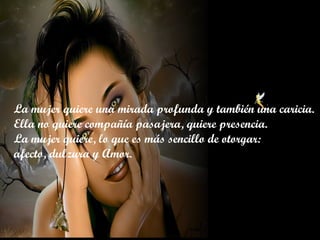El documento describe lo que una mujer realmente desea de una relación, como afecto, tacto, palabras de aliento, tiempo de calidad y amor verdadero, en lugar de solo atención o compañía superficiales. Enfatiza que una mujer es un ser sentimental complejo, no solo un cuerpo, y que debe ser tratada con respeto y comprensión.
