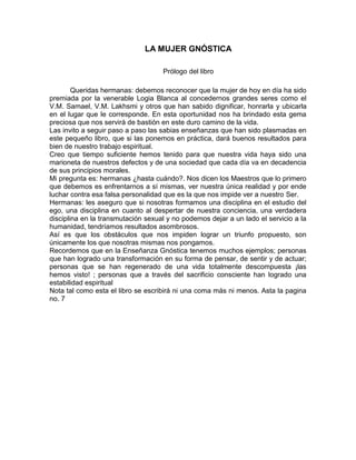 El prólogo presenta el libro como una guía espiritual para las mujeres. Insta a las lectoras a seguir las enseñanzas del libro para mejorar su trabajo espiritual. Reconoce que las mujeres han sido premiadas con maestros que las dignifican. El índice lista los seis capítulos que cubren temas como la mujer, su comportamiento, salud, relaciones, religión y camino espiritual.