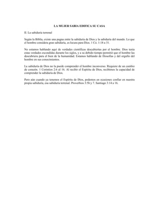 El documento habla sobre la sabiduría que las mujeres necesitan para edificar su casa según el versículo de Proverbios 14:1. Explica que la sabiduría bíblica se refiere a la habilidad para construir una vida exitosa. También describe las características de la sabiduría terrenal versus la sabiduría de Dios, la cual requiere una relación con Él y vivir libre de pecado. Finalmente, detalla algunas cualidades de la sabiduría como la paz, la amabilidad y la misericordia que son