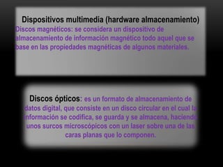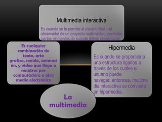 La multimedia interactiva permite al usuario controlar elementos de presentación, mientras que la hipermedia proporciona una estructura de elementos enlazados entre sí para que el usuario navegue. La multimedia interactiva se convierte en hipermedia cuando incluye esta estructura de enlaces. Los dispositivos multimedia de almacenamiento incluyen discos magnéticos, discos ópticos y unidades de cinta que usan propiedades magnéticas y ópticas para almacenar datos de forma digital.