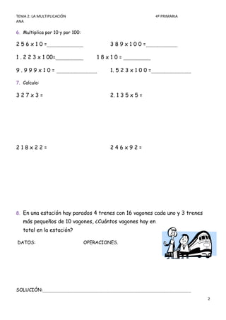 Este documento explica el tema de la multiplicación en 4o primaria. Define la multiplicación como una suma repetida de números iguales. Explica las propiedades de la multiplicación como la conmutativa y asociativa. Incluye ejemplos de multiplicar números, aplicar propiedades y resolver problemas que implican múltiples multiplicaciones.