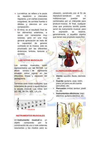 Este documento describe los elementos básicos de la música. Explica que la música se compone de sonidos y silencios, y que los sonidos tienen parámetros como la altura, duración, intensidad y timbre. Luego describe tres elementos fundamentales de la música: la melodía, la armonía y el ritmo. Finalmente, brinda una clasificación sencilla de los instrumentos musicales principales como de viento, cuerda, percusión e instrumentos eléctricos.