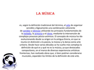 La música es un arte que organiza sonidos y silencios, y su concepto ha evolucionado desde la antigüedad hasta abarcar una variedad de experiencias artísticas. La historia de la música refleja la relación entre la evolución cultural y la música en diferentes sociedades, destacando su universalidad y origen en la naturaleza humana. Además, se menciona el jazz como una manifestación musical que fusiona influencias africanas y europeas, resaltando su origen en los Estados Unidos.