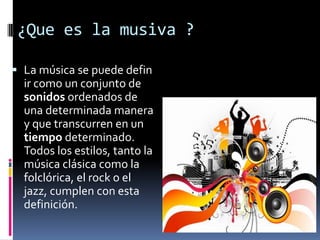 El documento describe los elementos básicos de la música como el ritmo, la melodía y la armonía. Explica que la música puede dividirse en tres grandes grupos: música clásica, música folclórica y música moderna. También habla sobre el rock como un estilo musical que ha influenciado a la sociedad desde mediados del siglo XX.