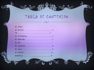 Este documento presenta una introducción a varios géneros musicales como el reggaetón, pop, electrónica, ranchera, rap, vallenato, salsa, merengue y música romántica. Explica brevemente los orígenes y ejemplos representativos de cada género.