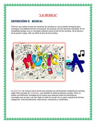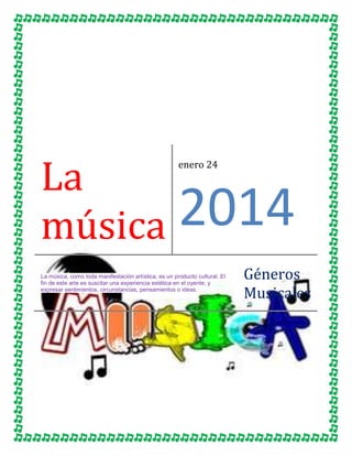 El documento proporciona definiciones de varios géneros musicales populares como la bachata, la música electrónica, el rap, el rock, el reggaetón, el reggae, el hip hop, la música clásica, el pop y la salsa. Describe los orígenes, características musicales y elementos constitutivos de cada género.