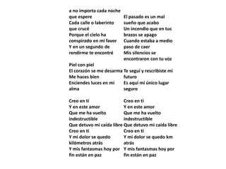 El documento es una colección de poemas que expresan sentimientos de amor, añoranza y devoción hacia una persona especial. Los poemas describen cómo el amor por esta persona ha transformado positivamente la vida del autor y cómo duele su ausencia. Resaltan la belleza, ternura y pasión que el autor siente por esta persona, a quien ve como un ángel y su único lugar seguro.