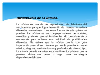 Este documento trata sobre la música. Explica que la música es el arte de organizar los sonidos y silencios de manera lógica y agradable al oído. Luego describe la importancia de la música para los seres humanos, ya que les permite expresar emociones y sentimientos. Finalmente, define las características fundamentales de la música como la melodía, armonía y ritmo, y cómo estas varían entre culturas.
