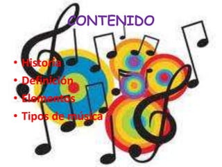 Este documento proporciona una introducción a la música, incluyendo su historia, definición, elementos y tipos. Explica que la música evolucionó de las artes combinadas de la antigua Grecia y que su definición ha cambiado con el tiempo. Define la música como la organización coherente de sonidos y silencios según patrones percibidos por los humanos. Describe los elementos fundamentales de la música como la melodía, armonía, ritmo y métrica. Finalmente, brinda ejemplos de diferentes tipos de música como la