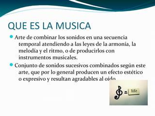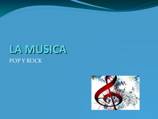 El documento define la música como el arte de combinar sonidos siguiendo las leyes de la armonía, melodía y ritmo. Explica que el rock es un género musical de ritmo marcado nacido de la fusión de estilos estadounidenses y popularizado en la década de 1950, mientras que el pop es un género comercial alternativo más suave del rock and roll enfocado a los jóvenes. Finalmente, proporciona listas de los mejores artistas y canciones de rock y pop de diferentes años.