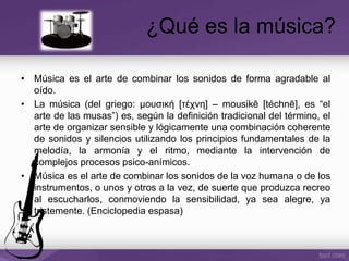 Este documento presenta información sobre la música. Define la música como el arte de combinar sonidos de forma agradable al oído utilizando principios como la melodía, armonía y ritmo. Explica brevemente la historia de la música y cómo ha evolucionado desde sus orígenes vinculados a la caza y la guerra. Además, describe diversos géneros musicales como el rock, pop, electrónica, rap e hip hop, y tipos de música tradicionales del Perú como la criolla, marinera y festejo.