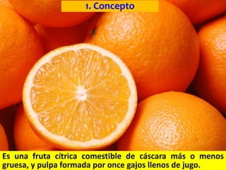Este documento proporciona información sobre la naranja, incluyendo su origen incierto en China o Japón, sus usos como jugo, postres y conservas que aprovechan sus beneficios como la vitamina C, y detalles sobre su producción y comercialización principalmente en el Perú y para exportación a Estados Unidos, Bélgica y Alemania.