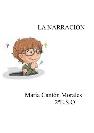 La narración se define como el relato de hechos reales o imaginarios que suceden a personajes. Contiene elementos como el narrador, los personajes y la acción. Se compone de un marco, la historia o trama y partes como el acontecimiento inicial, la reacción y la solución. Los personajes pueden ser personas u objetos y tienen personalidades. El narrador presenta a los personajes y cuenta la historia en primera o tercera persona.