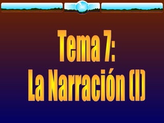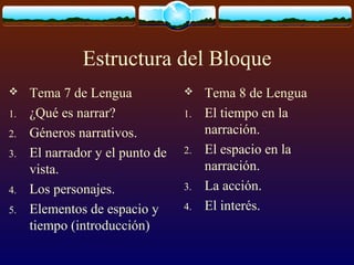 El documento aborda la narración en la lengua castellana y literatura, con un enfoque en los géneros narrativos, la estructura de la narración y los elementos que la componen, como personajes, tiempo y espacio. Se describen distintos géneros narrativos, desde cuentos hasta novelas, así como la evolución de la narración desde la tradición oral hasta la impresión en libros. Además, se discute la importancia de la acción y el interés en la narración para captar la atención del lector.
