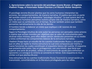 El documento resume las ideas de varios autores sobre la narración. Jerome Bruner plantea que los seres humanos interpretan la realidad de forma narrativa. Vladimir Propp analizó cuentos rusos y encontró que siguen una estructura común. Robert Darnton y Walter Benjamin señalan que los cuentos orales suelen tener una enseñanza moral. La narración implica una trama causal que une los hechos de forma coherente.