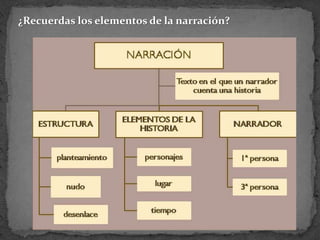 La narración literaria combina características de la narración y los textos literarios. Cuenta una historia ficticia con el objetivo de entretener, emocionar o transportar a mundos imaginarios. Puede tener un narrador en primera o tercera persona y personajes principales y secundarios. Además, la historia se desarrolla en un espacio y un tiempo reales o imaginarios, ya sea en el pasado, futuro o época actual.