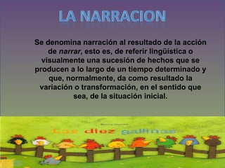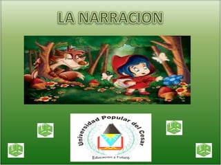El documento define diferentes tipos de narrativa como cuentos, fábulas, mitos y leyendas. Explica que un cuento es una narración breve de ficción con pocos personajes y una trama sencilla, mientras que las fábulas usan animales con características humanas para enseñar una lección. Los mitos describen historias antiguas sobre dioses y héroes con significado ritual, y las leyendas incluyen elementos sobrenaturales que se transmiten de generación en generación.