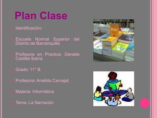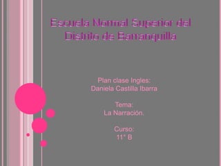 Este documento presenta un plan de clase para enseñar sobre la narración a estudiantes de 11° grado. Explica que una narración cuenta una serie de eventos que le ocurren a personajes, ya sean reales o ficticios. Luego define los elementos clave de la narración como el narrador, los personajes y la acción. Finalmente, describe las partes de una narración incluyendo el marco, la historia y la trama, la cual contiene el acontecimiento inicial, la reacción, la acción y la solución.