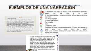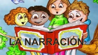 La narración es el proceso de contar una secuencia de acciones realizadas por personajes en un espacio y tiempo determinados, siendo estas acciones tanto reales como imaginarias. Se manifiesta en diferentes ámbitos como el cotidiano, literario y periodístico, y se caracteriza por la presencia de una introducción, un nudo y variaciones temporales en la presentación de los hechos. La estructura narrativa se relaciona con el orden de los sucesos y la importancia temporal de cada evento, aunque también puede presentar desventajas como una interpretación limitada de hechos y la posibilidad de generar desinterés en los oyentes.