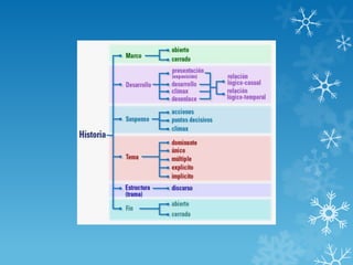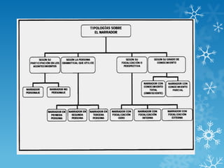 El documento presenta diferentes tipos de narradores y perspectivas narrativas. Describe al narrador protagonista, testigo y omnisciente, así como los conceptos de focalización interna, externa y cero. También cubre el narrador de conocimiento relativo y el enfoque narrativo múltiple, donde la historia es contada desde las perspectivas internas de varios personajes.