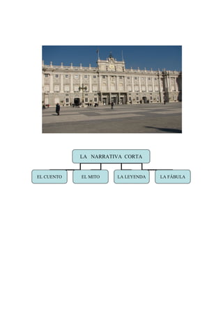El documento trata sobre diferentes tipos de narraciones en prosa, incluyendo cuentos, mitos, leyendas y fábulas. Se describen características y clasificaciones, como cuentos populares (anónimos) y literarios (con autor), así como mitos que explican orígenes y misterios del mundo y fábulas que presentan enseñanzas morales. Se mencionan mitologías destacadas y tipos de leyendas relacionadas con personajes y sucesos reales que incluyen elementos fantásticos.