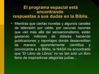 El documento resume cómo la NASA encontró evidencia en la Biblia que resolvió un error en sus cálculos astronómicos. Referencias bíblicas como Josué 10:12-13 explicaron un día perdido, mientras que 2 Reyes 20 explicó 40 minutos adicionales. Esto demostró la precisión científica de la Biblia y cómo Dios aún obra maravillas en el universo.