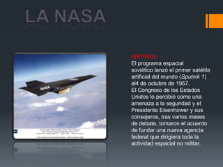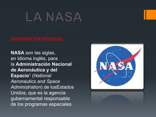 La NASA es la agencia gubernamental de Estados Unidos responsable de los programas espaciales. Fue fundada en 1958 en respuesta al lanzamiento del Sputnik 1 por la Unión Soviética. Durante el programa Apolo, la NASA sufrió la pérdida de tres astronautas en un incendio durante un ensayo del Apolo 1, pero luego logró su objetivo principal con el alunizaje exitoso del Apolo 11 en 1969.
