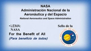 La NASA es la agencia espacial civil de Estados Unidos, fundada en 1958 por el presidente Eisenhower. Se encarga del programa espacial no militar del país y la investigación aeroespacial. Algunos de sus principales programas históricos incluyen Mercury, el primero en enviar astronautas al espacio; Apolo, que logró llevar humanos a la Luna entre 1969 y 1972; Skylab, la primera estación espacial estadounidense; y el Transbordador Espacial, el principal vehículo espacial de la NASA entre los años 70 y 80.