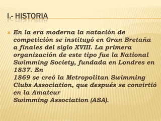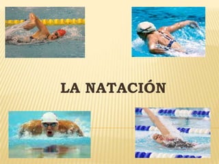Este documento resume la historia y concepto de la natación y describe los cuatro estilos principales de natación: crol, mariposa, pecho y espalda. Brevemente explica que la natación moderna se originó en Gran Bretaña a finales del siglo XVIII y que requiere aprender habilidades motoras. Luego define cada estilo y ofrece consejos básicos sobre la técnica correcta para cada uno.