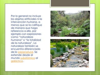 La naturaleza se refiere al mundo físico y a la vida en general, incluyendo plantas, animales y procesos asociados con objetos inanimados. Generalmente no incluye objetos artificiales ni intervención humana. La naturaleza se extiende desde el mundo subatómico hasta el galáctico y a menudo se considera el entorno natural no alterado sustancialmente por los seres humanos.