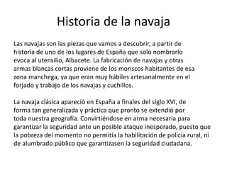 La navaja se originó en España a finales del siglo XVI cuando los moriscos de Albacete eran hábiles en el forjado de navajas y cuchillos. La navaja se extendió por toda España y se convirtió en un arma necesaria para la seguridad personal debido a la pobreza y falta de policía. Aunque se han encontrado restos de navajas en sepulturas ibéricas y romanas, la navaja española como instrumento de uso generalizado surgió a finales del siglo XVI como un arma de defensa plegable y oc