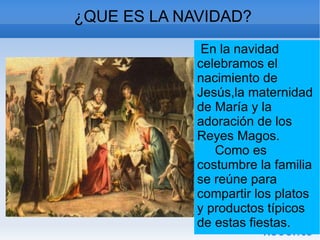 La Navidad celebra el nacimiento de Jesús y la adoración de los Reyes Magos. Es una fiesta de alegría y encuentro entre los hijos de Dios donde María desempeña un papel protagonista gestando y acogiendo a Jesús. La Navidad no es olvidarse de los que están solos o sin comida, ni consumir sin sentido sino compartir con los demás y la palabra de Dios.