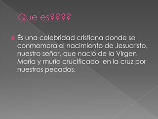 La Navidad conmemora el nacimiento de Jesucristo y se celebra con el pesebre, el árbol, luces y una comida con la familia. También se intercambian regalos.