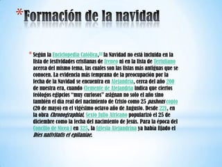 La Navidad no aparece en las primeras listas de festividades cristianas. La evidencia más temprana de la preocupación por la fecha de la Navidad data del siglo III d.C. en Alejandría, aunque Sexto Julio Africano popularizó el 25 de diciembre como fecha del nacimiento de Jesús en el siglo III. Para el siglo IV, la Iglesia Alejandrina ya había fijado el 25 de diciembre como la fecha de la Natividad, aunque los evangelios no mencionan la fecha de nacimiento de Jesús. La Ig