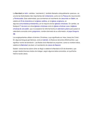 La Navidad conmemora el nacimiento de Jesucristo el 25 de diciembre y es una de las festividades más importantes del cristianismo. Algunas iglesias ortodoxas, como la rusa y la de Jerusalén, celebran la Navidad el 7 de enero debido a que no aceptaron la reforma del calendario. La Navidad se propone celebrar la Natividad de Jesús a través de diversas tradiciones como misas, reuniones familiares y el intercambio de regalos.